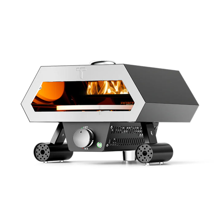 The oven operates on propane and features a lightweight build that supports easy setup in your backyard, patio, or even packed up for camping trips and tailgating. Its quality construction includes a shock-resistant ceramic stone for longevity. Every oven includes a necessary set of components to start cooking immediately: a dedicated perforated aluminum pizza peel and the 12" cordierite cooking stone, providing immediate value for the dedicated pizza enthusiast.
