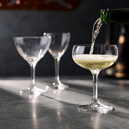 Set of 4 drinking glasses 12.5 Oz. capacity Made of durable glass Features a unique '20s design Dishwasher safe Manufactured by Trudeau and Bormi...