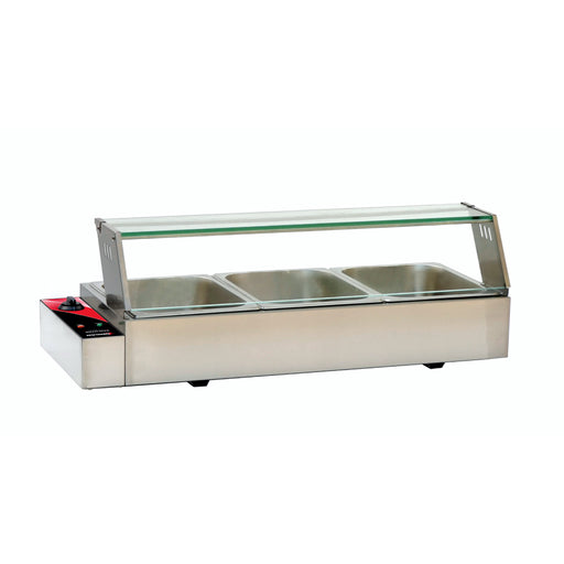 36" bain marie Stainless steel construction Temperature ranges from 29.4°C to 79.4°C (85°F to 175°F) Includes glass sneeze guard, 3 clear lids, a...