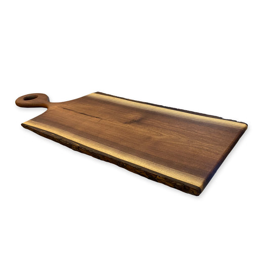Made from solid walnut wood Handcrafted with bark and handle Measures 10” x 25” Ideal for serving charcuterie, cheese, and other appetizers Smoot...