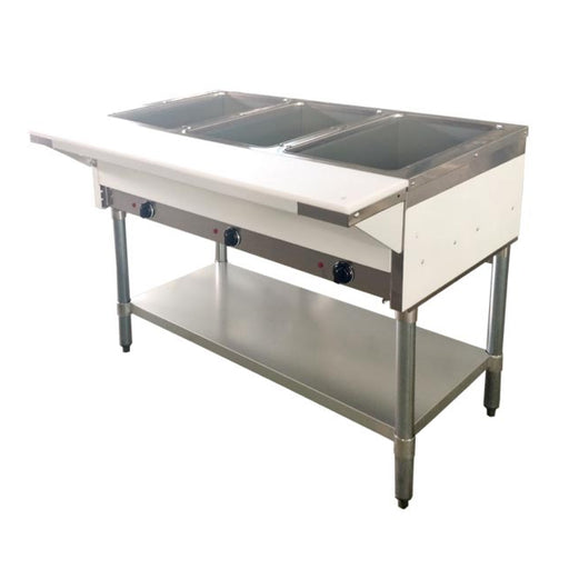 44" propane open well steam table 3-pan tray for food placement Stainless Steel construction Includes a cutting board for food preparation Featur...