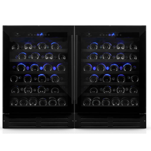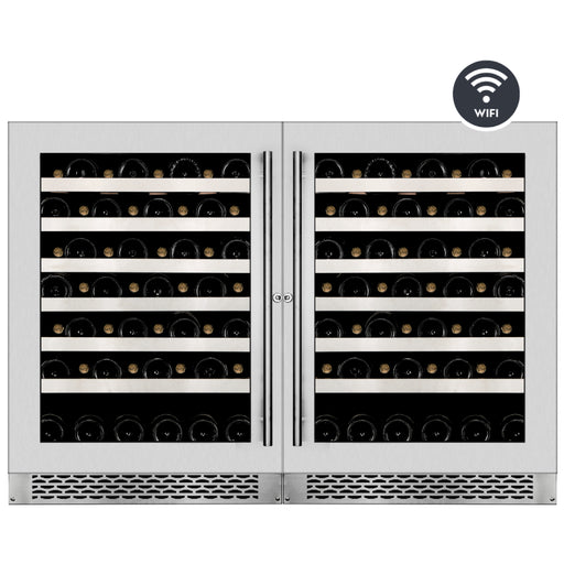 48" wine cabinet 108 bottles capacity Seamless glass reversible door Blue and white LED lighting 12 sliding shelves in wood Embraco (Inverter) co...