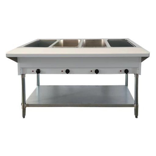 58" propane open well steam table 4-pan tray for food placement Stainless Steel construction Includes a cutting board for food preparation Featur...