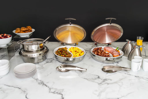 • A modern design, perfect for casual and formal settings• Stainless steel with highly polished mirror finish dome covers• Roll-top covers can st...