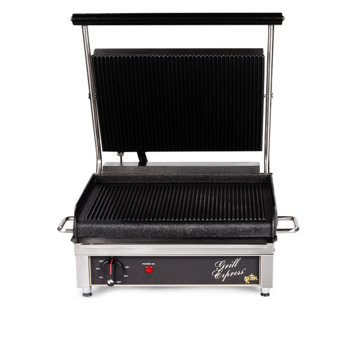 Constructed of sturdy stainless steel Flat surfaces are made of cast iron Balanced top plates adjust automatically to food thickness Removable gre...