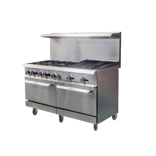 60" 6-burner, 2 standard ovens commercial range 24" radiant charbroiler Stainless steel construction Adjustable thermostatic controls Oven door, ...