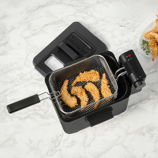 3.7 Qt. basket capacity Temperature range 129°C - 190°C (265°F - 375°F) Stainless steel basket with cool-touch handle Side-mounted control knob f...