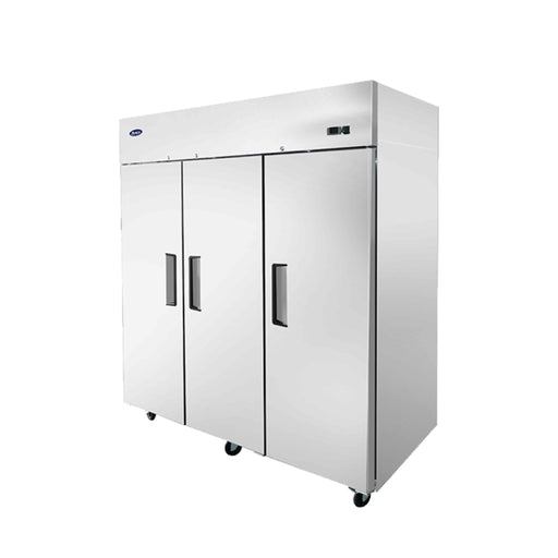 78" 3-door reach-in refrigerator Stainless steel construction Self-closing doors with stay-open feature 9 adjustable heavy-duty PVC coated shelve...