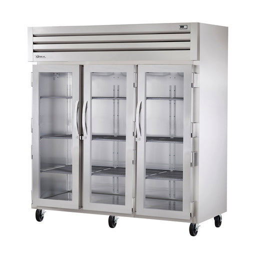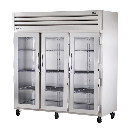 This True STG3R-3G 77" three-section reach-in glass swing door refrigerator is factory engineered, self-contained, capillary tube system using en...