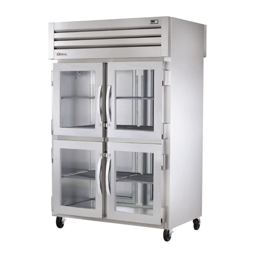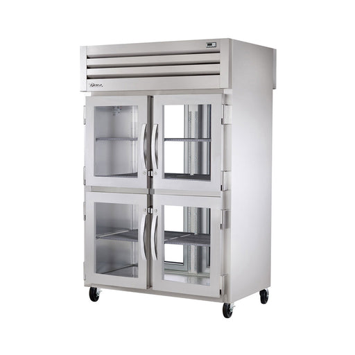This True STG2RPT-4HS-2G-HC 52" pass-thru solid half front / glass rear swing door refrigerator is factory engineered, self-contained, capillary tu...