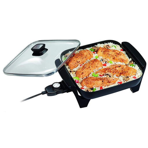 Nonstick cooking surface Adjustable heat Cool-touch handles Glass lid Description Features: 121 square inch cooking surface Adjustable tempera...