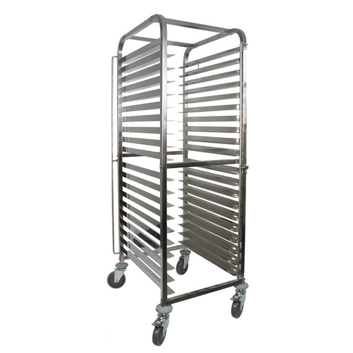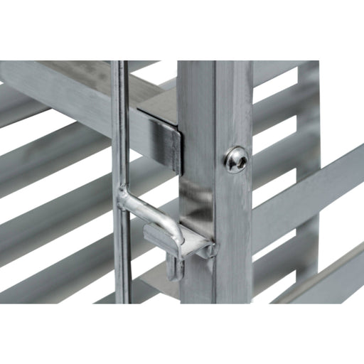 12 tier food tray rack Stainless steel construction Holds up to 500Lbs of capacity Dual-ended locking bars prevent pans from sliding out Full-swi...