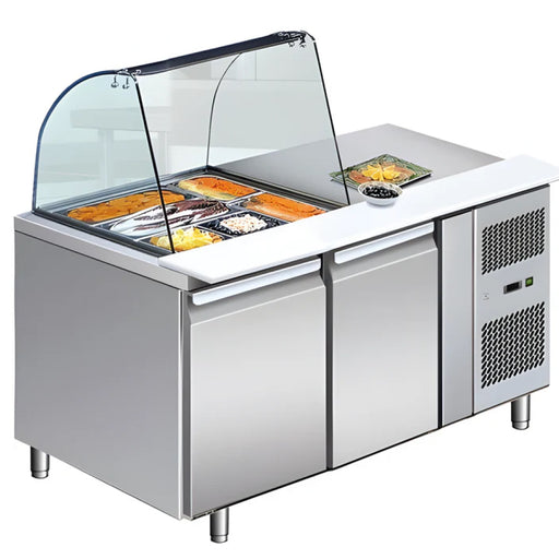 Stainless steel construction 54" width prep surface area Manages a temperature range between -2°C to 8°C (28°F - 46°F) Professional sneeze guard ...