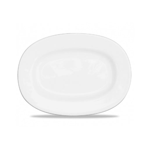 14.3" x 11.5" oval rimmed plate Made of high-quality ceramic material Comes in a case of 6 Chip-resistant and scratch-proof Rimmed design helps p...