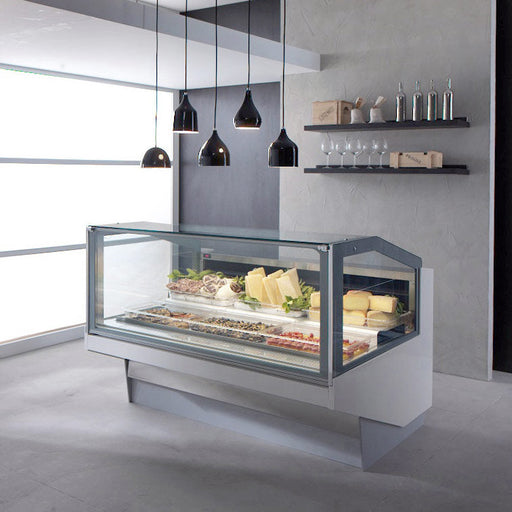 Features a curved glass design for maximum product visibility Double pane lift-up front glass Double pane sides Lift-up deck and evaporator to al...