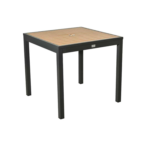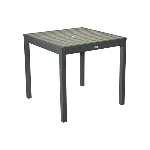Designed for standard dining use Can accommodate 4 people Includes a hole for an umbrella Square tubular aluminum powder-coated frame Polywood sl...