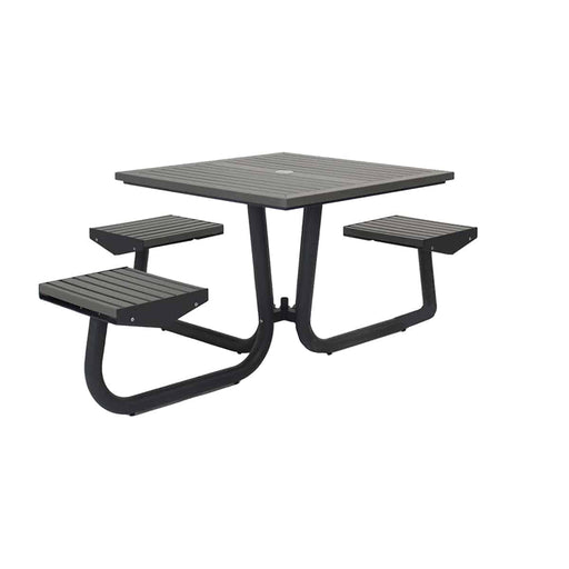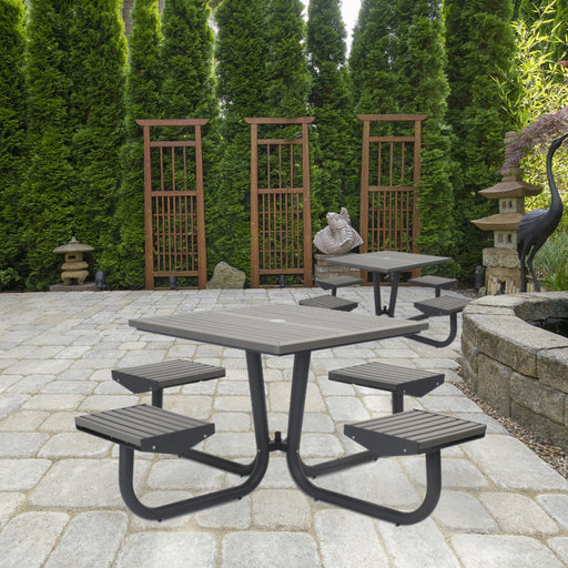 Designed for standard dining use Can accommodate 4 people ADA Compliant Includes a hole for an umbrella Square tubular aluminum powder-coated fra...