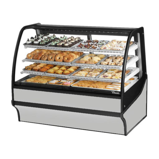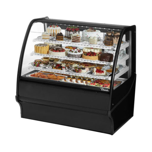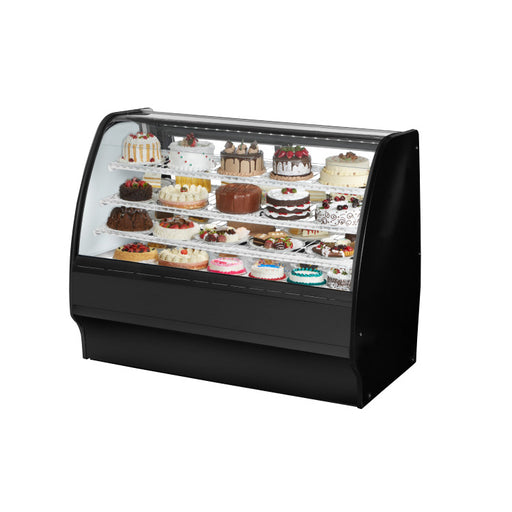 This True TDM-DC-59-GE/GE-B-W 59" Curved Glass / Glass End Dry Case Display Merchandiser in Black combines efficient, high volume merchandising w...