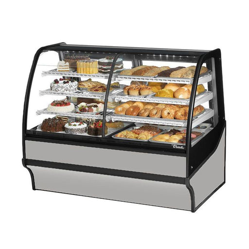 This True TDM-DC-59-GE/GE-S-W 59" Stainless Steel Curved Glass / Glass End Dry Case Display Merchandiser combines efficient, high volume merchand...