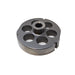 The #52 Stainless Steel Machine Plate with Hub, Triple Notch, and Flat Sides - 5-1/8" Diameter, 1-1/4" Hole Size - 11180 is specifically engineered for exceptional meat grinding tasks, designed to accommodate the need for extremely coarse ground meat. This heavy-duty plate is constructed from high-quality stainless steel, ensuring durability, corrosion resistance, and easy maintenance. With a substantial 5-1/8 inch diameter and a large 1-1/4 inch hole size, it is ideal for processing meat into very chunky pieces, suitable for specialized culinary applications. The integrated hub, triple notches, and flat sides provide a secure, stable fit with #52 meat grinders, maximizing efficiency and consistency in the grinding process. This machine plate is essential for food processing operations and culinary professionals who require robust, reliable equipment for large-scale meat preparation.