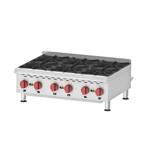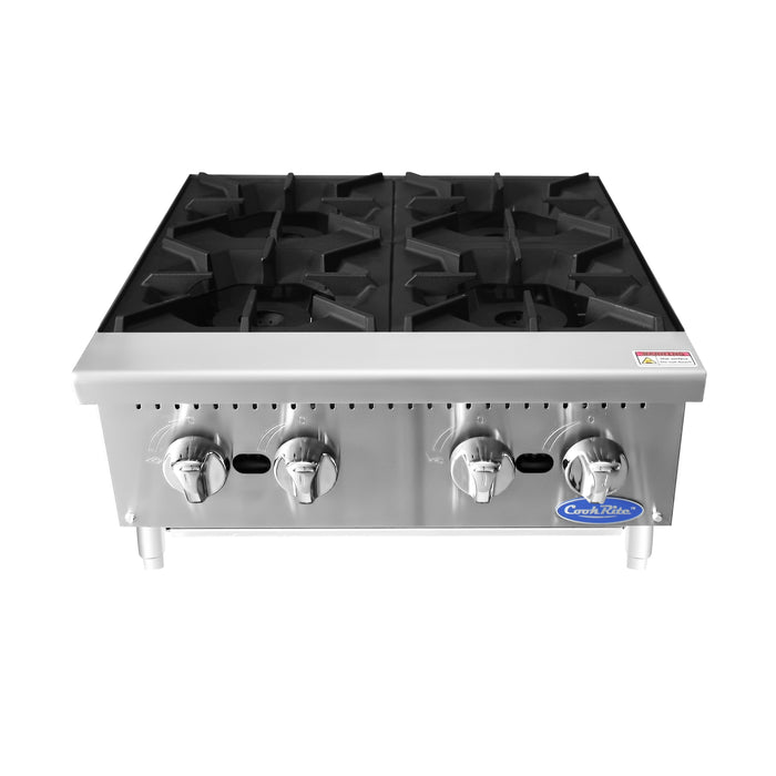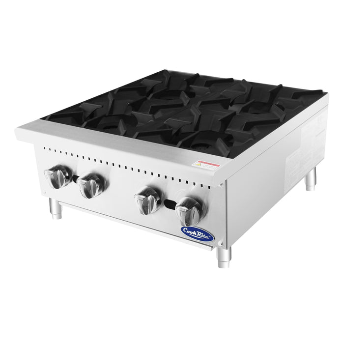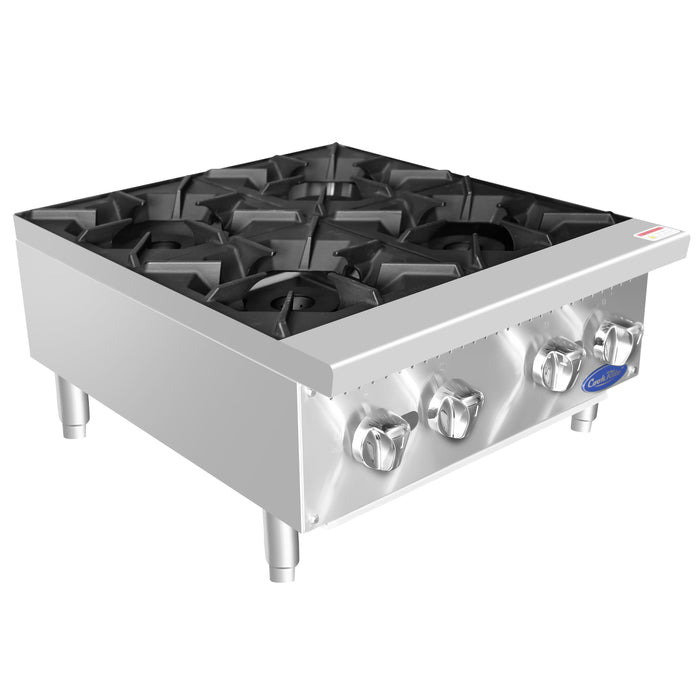 Use the Atosa ACHP-4 Heavy Duty Four Burner Hot Plate, 24" for preparing sauces, stews, and a variety of foods quickly and easily. Boasting a compact countertop design, this commercial hot plate is suitable for use in catering halls, concessions stands, cafes, and food trucks withi limited cooking space or in commerical kitchens when additional cooking space is required. Featuring four 32,000 BTU burners, you can prepare different dishes simultaneously to keep up with demand.