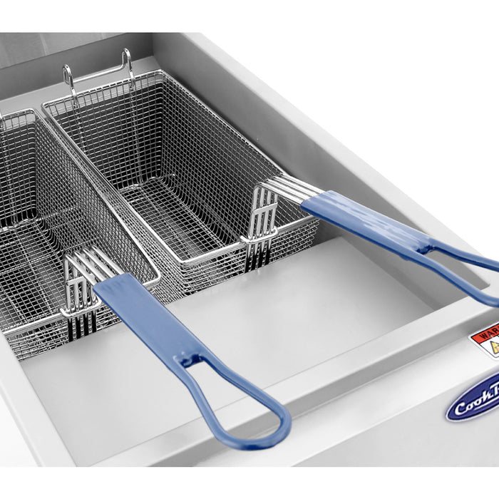 The Atosa CookRite ATSF-40 is a natural gas commercial deep fryer with a 40 pound oil capacity. It is made of stainless steel, both interior and exterior, and the tank is welded. It has a high-quality thermostat that maintains the selected temperature between 200°F-400°F.