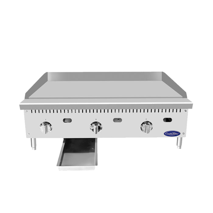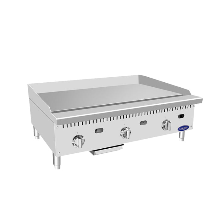 CookRite Heavy Duty Griddle, gas, countertop, 36"W x 28.60"D x 15.20"H, (35.70"W x 19.90"D cooking area), 1" thick griddle plate, (3) stainless steel burners, standby pilots, thermostatic controls, stainless steel structure, adjustable stainless steel legs, 75,000 total BTU's, cETLus, ETL-Sanitation