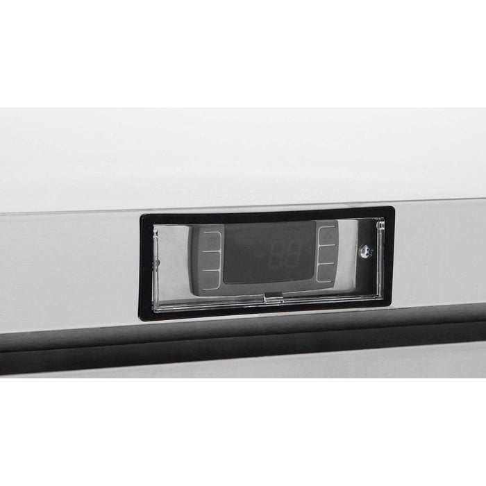 Its refrigeration system is self-contained and designed to provide balanced refrigeration even under the most demanding of environments. The air-cooled system maintains product temperatures between 33°F and 38°F (0.5°C - 3.33°C) thanks to the high-tech Dixell digital temperature controller.