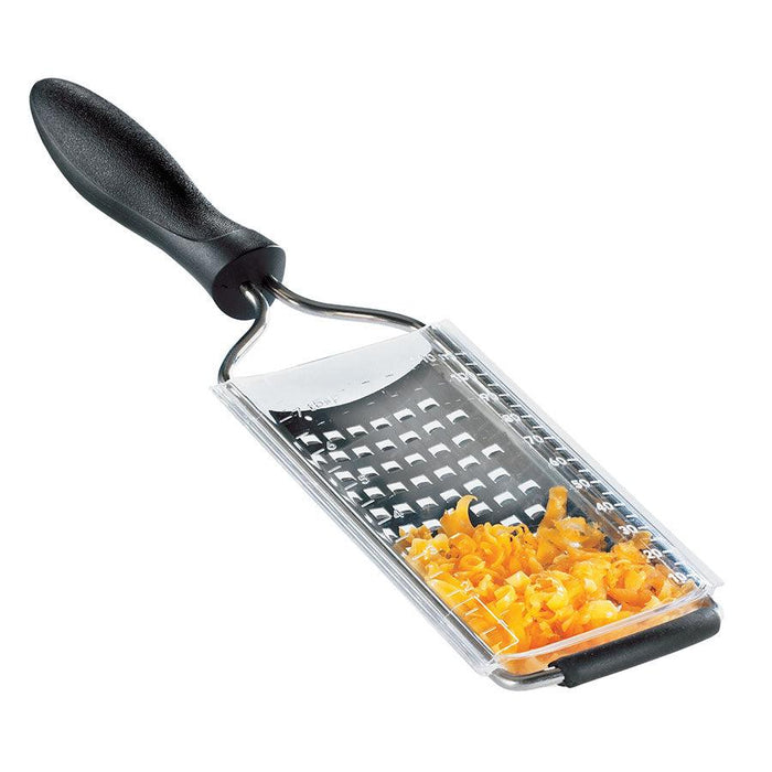 Exclusive Surface Glide Technology - a repeated grooved patter that is etched on the face of the grating surface to provide a perfect balance for grating & maximize efficiency. Thanks to its ergonomic nylon handle, this grater provides a sturdy and secured grip.