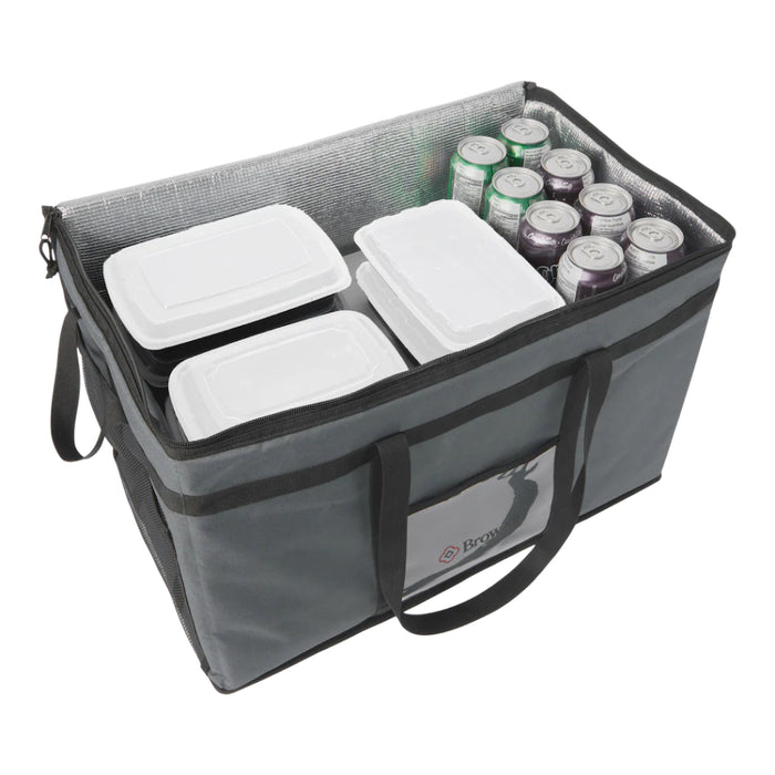 The Browne 575389 23" x 15" x 14" Insulated Delivery Bag - Grey is a high-quality product designed to make food delivery a breeze. This spacious bag provides ample space for carrying multiple food orders at once. It is built to withstand frequent use and maintain its shape and insulation. The grey color gives it a professional appearance, making it perfect for both personal and commercial use.