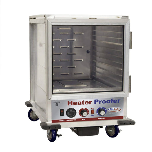hotLOGIX holding cabinet with fixed wire slides for 12”x20”x2.5” or 18”x26” pans on adjustable, removable racks. Aluminum interior and exterior, single wall, non-insulated construction with removable blower heating module. Capable of heating to 190°F (88°C). 5” diameter rubber casters; 2 with brakes. Single panel tempered glass door with magnetic latch. Single electric connection, 120 volts, 1750 watts,15.0 amps, 60 Hz, single phase, eight foot rubber cord with grounding plug, NEMA 5-20P.