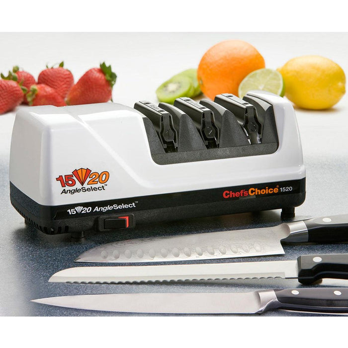 The Chef’sChoice Model 1520 sharpener uses a 3-stage system for sharpening all types of knives. The first two stages sharpen and hone the knife’s edge using 100% diamond abrasives. The first stage is for knives with a 15 degree edge and the second stage is for 20 degree knives.
