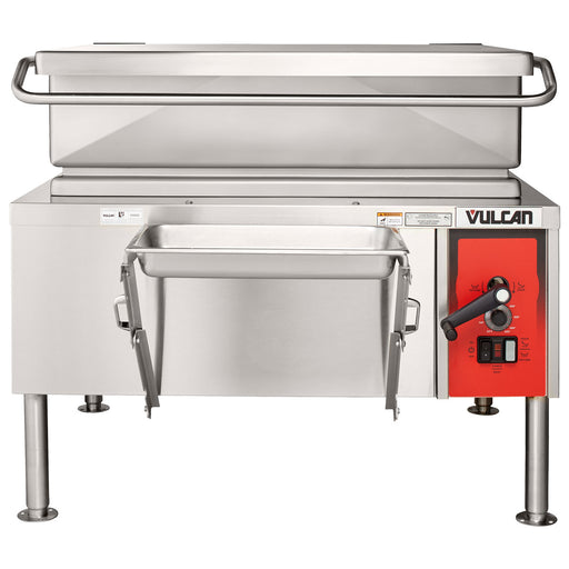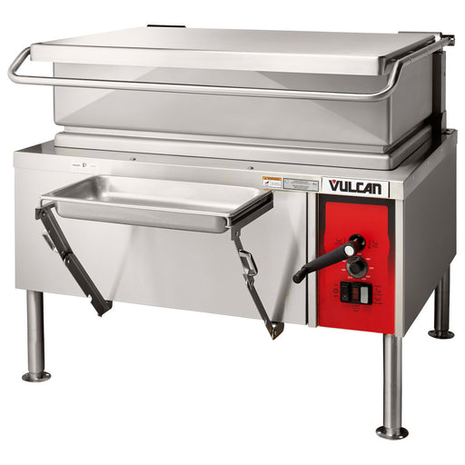 Easy-to-turn manual hand tilt. Optional power tilt with manual override available.Gallon/Liter Markings and Vented Spring Assist Cover standard.Optional 2" Tangent Draw-Off Valve available. 10° Cooking Feature. Tilt unit up to 10° without the power being turned off. Adjustable, Electronic Thermostat accurately controls temperature from 100° to 450° F.