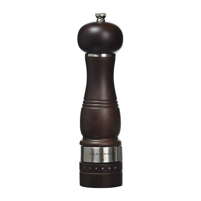 Modern spin on a classic design, the Cole & Mason 8.5" H59432GCB Gourmet Precision Ardingly Carbon Salt Mill is crafted from walnut stained beech wood with stainless steel detail.