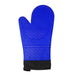 This oven mitt is made from a combination of dark blue silicone and flame-resistant cotton. It features a non-slip grip on the palm and fingers for extra safety. The 15" length provides ample protection from heat and steam when handling hot items.