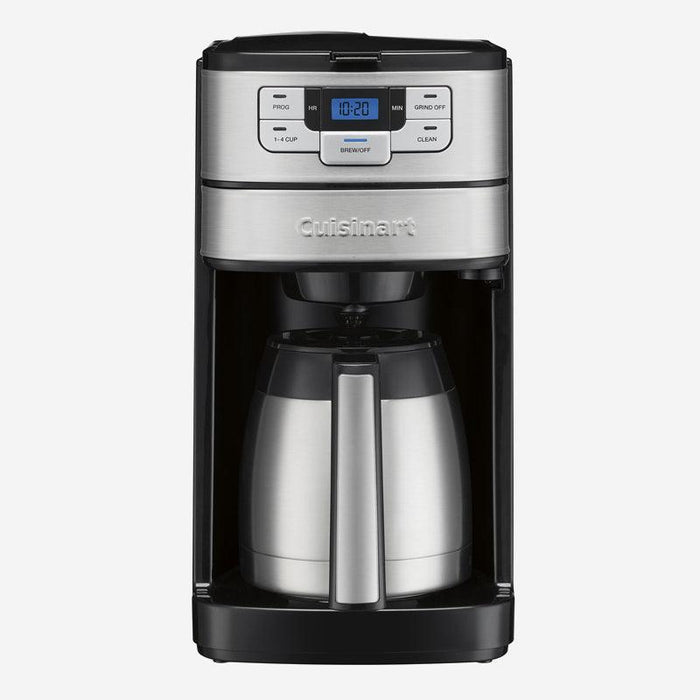 Making fresh-ground coffee at home is easy with the Cuisinart Automatic Grind & Brew 10-Cup Thermal Coffeemaker. Designed with a powerful blade grinder that automatically grinds beans just before brewing. This coffeemaker does all the work for you with programmable 24-hour brew start, auto-off, and 1-4 cup setting options. Preset to have a pot of hot, delicious coffee ready first thing in the morning. Don't want to wait for a full pot to brew? Use the Brew Pause feature to enjoy a cup without interrupting the brew cycle. Have pre-ground coffee? Use the grind-off option to brew it to perfection. Versatile and simple to use, the Automatic Grind & Brew spares you the trip to the coffee shop. Maximum convenience and fresh, full-bodied flavour assured!
