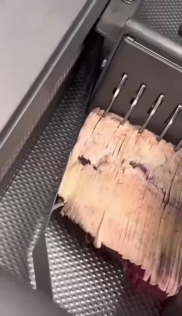 It features an advanced hydraulic (electric) feed system that guides the meat smoothly and effectively through the machine. This attribute is particularly essential for intensive use where the machine is operated under especially humid conditions or colder environments.