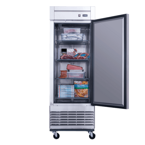 This unit includes 6 gray epoxy-coated shelves to make organization a breeze. Plus, it has (4) 5" locking casters that allow you to slide the freezer out from the wall for cleaning and maintenance. This efficient freezer comes with a 3/4 hp top-mounted refrigeration system that uses R-290 refrigerant, with a TXV expansion valve and hot gas condensate removal for precise, efficient operation. This unit requires a 115V electrical connection.