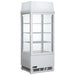 The EFI CGSM-1742-W-L 17" White Square Glass Floor Refrigerated Display Case with Light Box on Top is built for maximizing product visibility and maintaining optimal temperatures. This 17" wide unit, with a 2.8 cu. ft. capacity, is an excellent choice for bakeries, delis, and cafes. Its white square glass construction provides a clean, modern look that will complement any commercial setting. The unit's design ensures a clear view of pastries, beverages, and other chilled items, making it easy for customers to select their purchases.