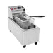 The Eurodib SFE01860-220 electric countertop fryer has a 2-gallon capacity and an immersion-type stainless steel element. Operating from 105 to 370 degrees Fahrenheit, this unit has thermostatic controls. Made of stainless steel, the unit is strong and simple to clean. The head assembly tilts back and can be removed, so the operator can remove the tank for cleaning. To protect the components, thermal overload protection checks for overheating and shuts the unit down if needed. A nickel-plated fry basket is included, and non-skid feet keep the fryer stable.