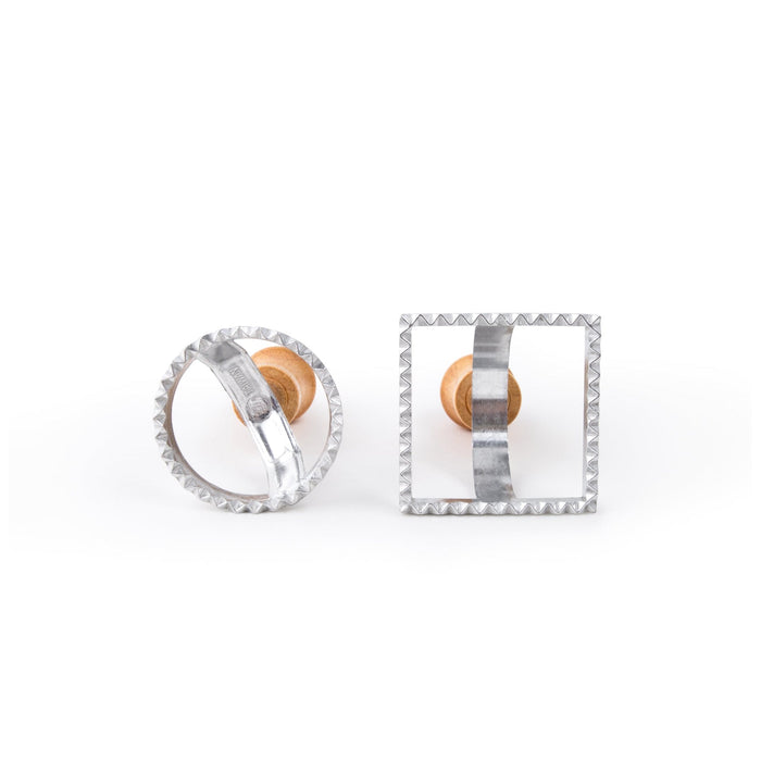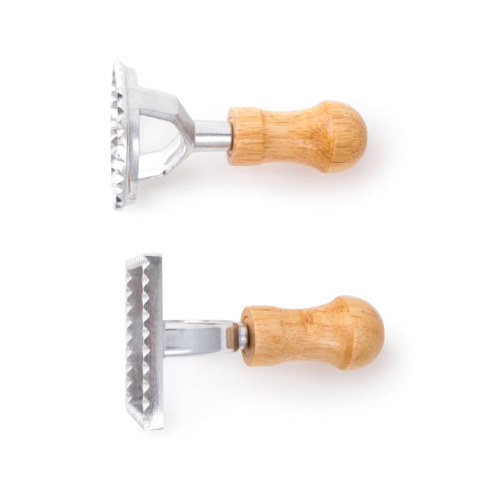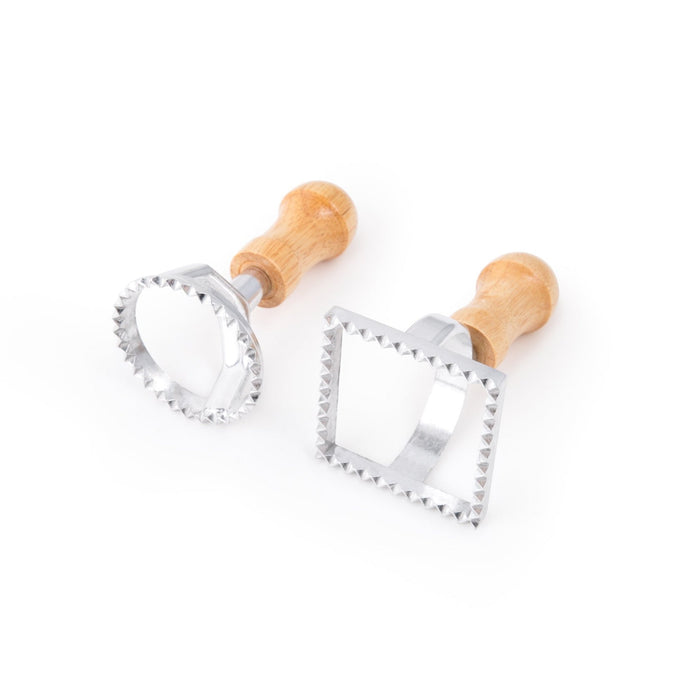 This ravioli set comes with 2 pieces, including a 2.5" round and a 2.75" square stamps. They both measure 4.5" in height, and are made of lightweight, yet sturdy aluminum frame with wood handle. Thanks to their specialized designs, you can easily cut perfectly-sized pasta pockets, while their wooden handles provide comfortable and secure grip. This ravioli cutter set is great for cutting and sealing any homemade raviolis.