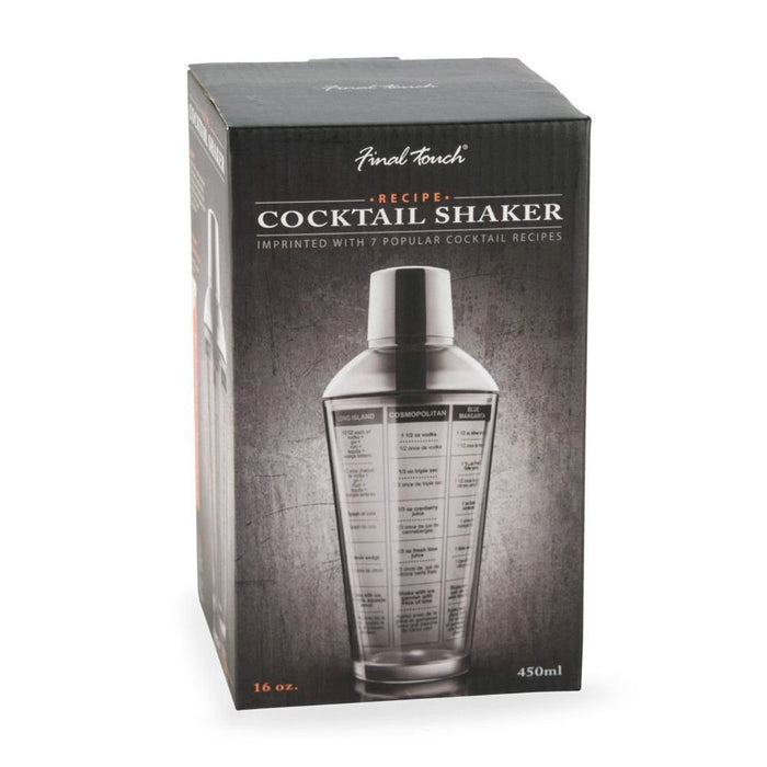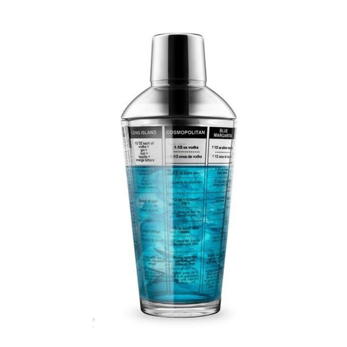 Imprinted with measurements in both ounces and millimeters and 7 popular cocktail recipes, including Long Island, Cosmopolitan, Blue Margarita, Mojito, Tequila Sunrise, Kamikaze, & Choco Martini.