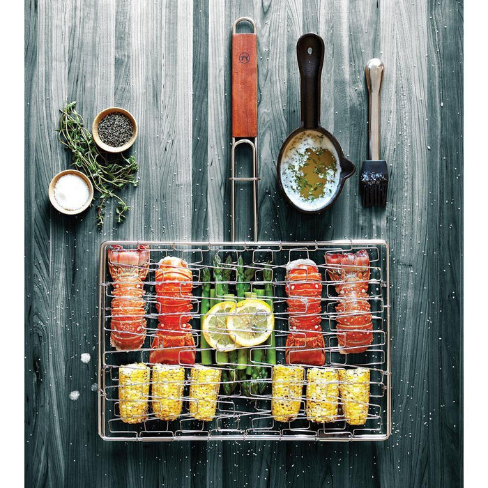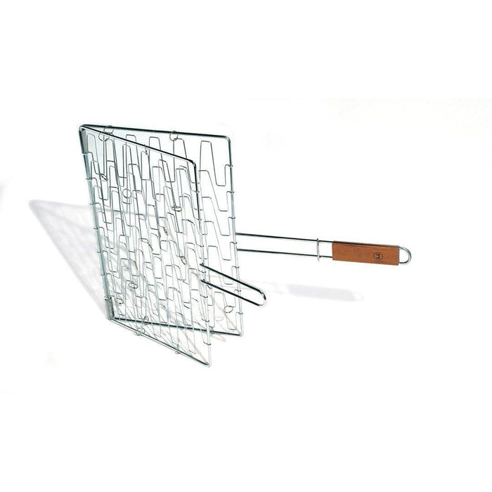 The chromed carbon steel basket flexes and molds to hold food securely in place, fully protecting even the most delicate foods. The basket features a stylish hardwood handle, keeping your hands cool and away from the heat source. This grill basket is perfect for grilling fish, corn, fillets, chops, and other delicate fruits, vegetables and breads. Say no more to lost food down the grill grates.