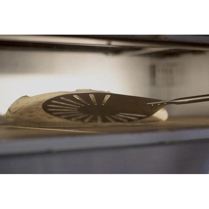 The peel’s small round head features a thinly milled edge that makes it easier to slide under pizza. The round shape allows for a larger portion of the edge to be milled, therefore letting you easily pick up pizza from all sides while providing you with excellent control when rotating and moving the pizza inside the oven. It also features perforations that make the peel lighter while reducing friction to allow excess flour to fall off easily, keeping your oven clean while preventing smoke and bitter tasting crust.