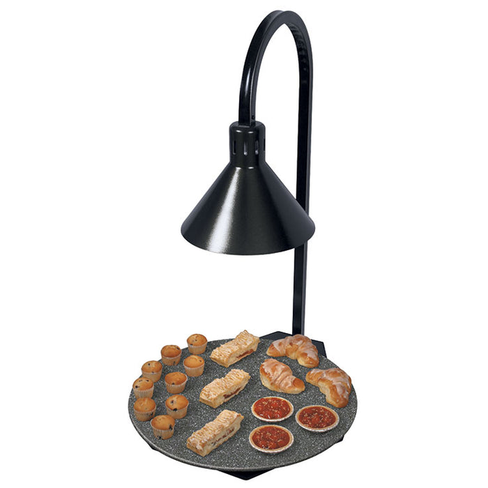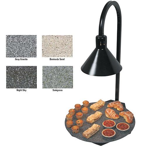 The Hatco Glo-Ray® Portable Round Heated Simulated Stone Shelf with Decorative Lamp has a blanket-type foil element to create a uniform heat across the entire foodsafe Swanstone® surface to hold food at safe-serving temperatures.