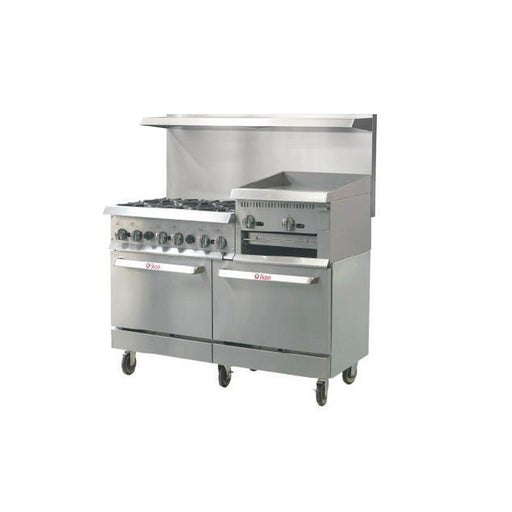 IKON IR-6B-24RG-60 Range, gas, 60″, (6) 30,000 BTU burners, manual controls, (1) 46,000 BTU 24” raised griddle/broiler with manual controls, (2) static ovens, 3-position oven rack, (4) oven racks, full pull-out crumb tray, thermostatic controls, riser with removable shelf, 12″ cast iron grates, porcelain coated oven interior door, sides & hearth, stainless steel front, back riser & lift off shelf, (6) 1″ adjustable legs, CSA-Sanitation, CSA Flame, CSA Star
