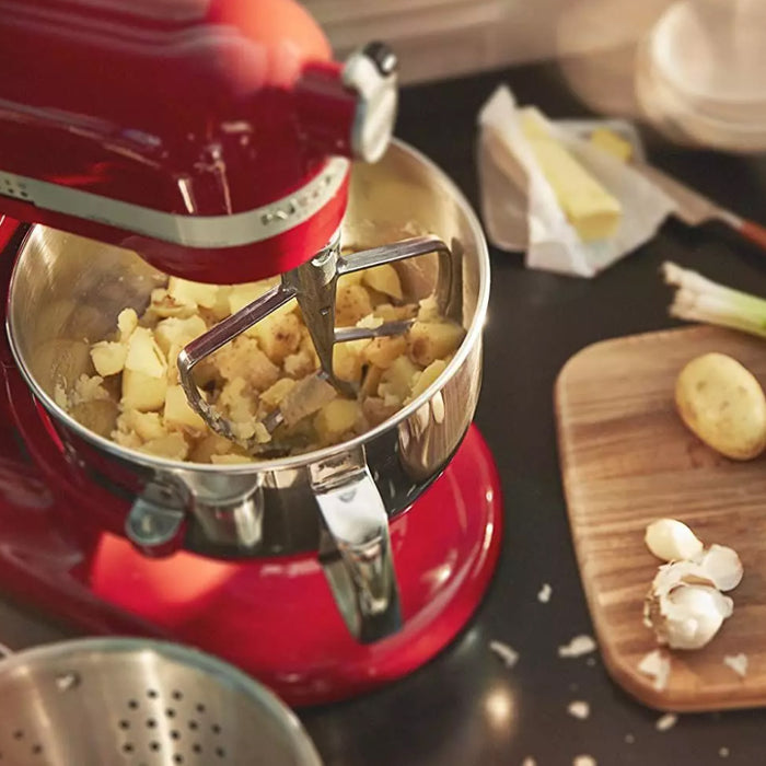 The bowl-lift design provides sturdy bowl support for stability when mixing heavy ingredients or large batches. The lever smoothly raises the mixing bowl into position for efficient beater-to-bowl contact.
