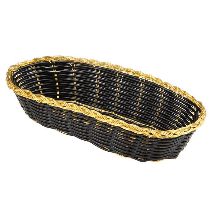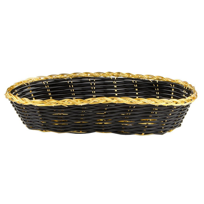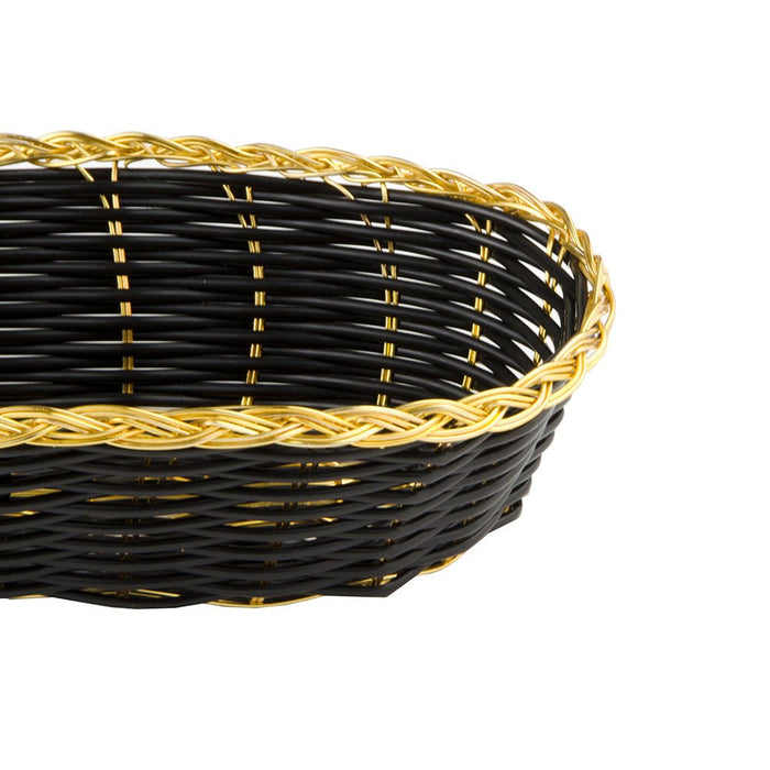 Featuring gold wire rims, this Update International BBV-94 9" x 4" Oval Bread Basket is ideal for breads, candy, crackers and snacks.