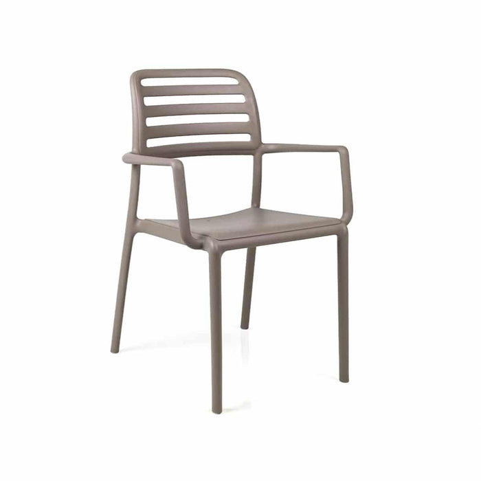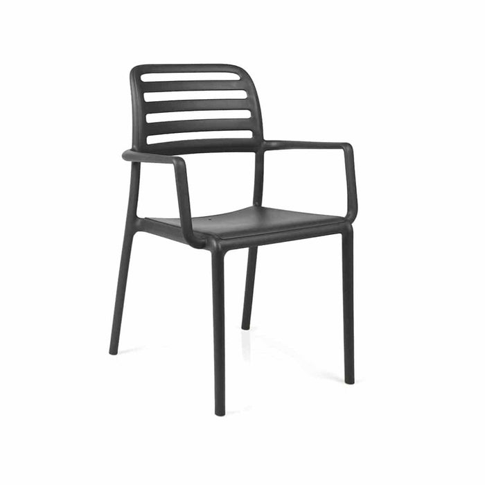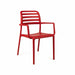 The Costa armchairs are commercial outdoor dining chairs with arms. They are a fantastic addition to any restaurant, patio, indoor/outdoor community pool, or backyard setting. The stylish Italian-made chairs are stackable with replaceable non-slip feet. They will not fade, peel, or rust. They are designed to last for years and withstand constant use. They are ergonomically designed for maximum comfort.