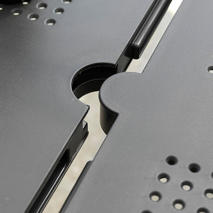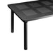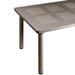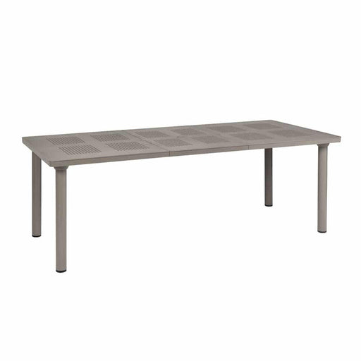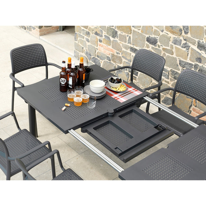 Extendable table with slatted wood effect DurelTop tabletop, composed of a double paper honeycomb core, perfectly enclosed with galvanized steel tubes embedded in the tabletop. The legs are in anodized or coated aluminum, attached with screws.
